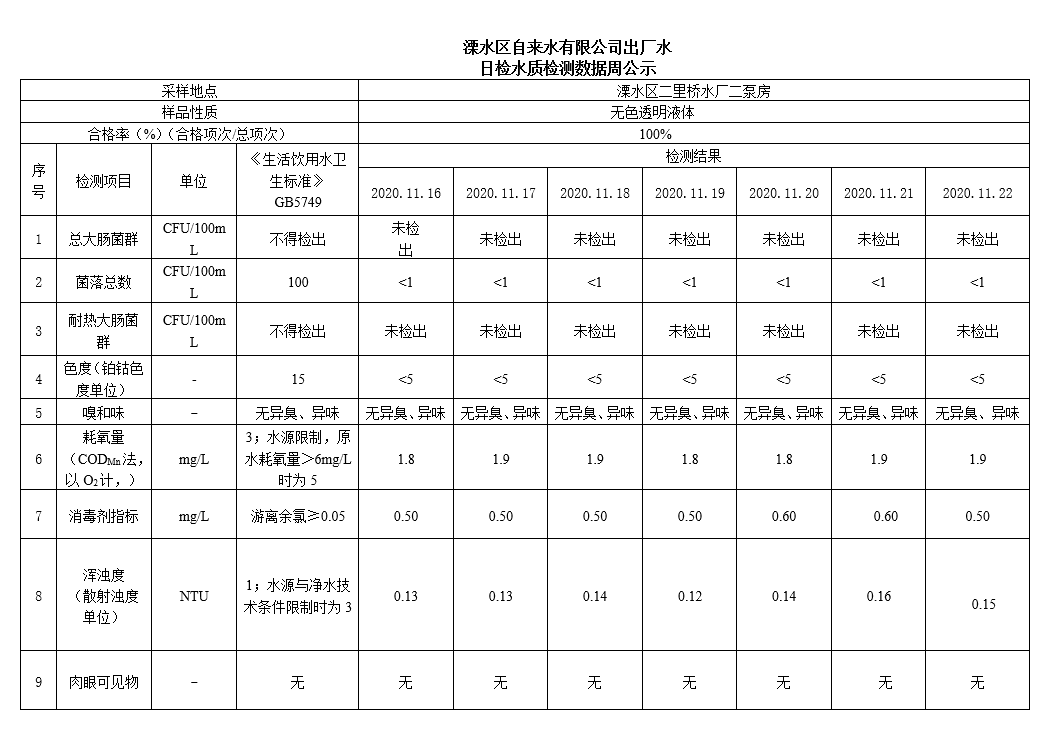 出廠水每周公示2020.11.24 時間:2020-11-24 分類:水質(zhì)公示 下一篇: 二次供水(半年度公示)2020.11.27 相關(guān)文章 出廠水每周公示2025.8.11-2025.8.17 2025.7.15管網(wǎng)水(月度公示) 出廠水106項公示(半年度公示)2025.6.27 2025.7.15出廠水、管網(wǎng)末梢水常規(guī)42項指標(biāo)(月度公示) 2025.7.29管網(wǎng)水(半月度公示) 出廠水每周公示2025.8.4-2025.8.10 出廠水每周公示2025.7.28-2025.8.3 出廠水每周公示2025.7.21-2025.7.27
