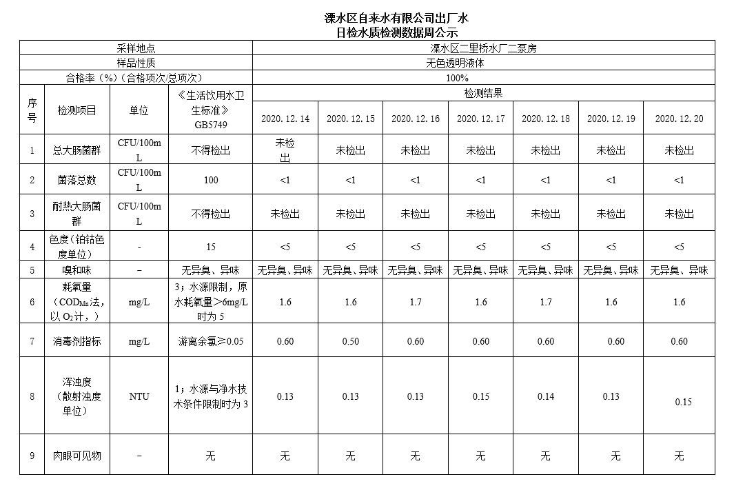 出廠水每周公示(2020.12.22) 時間:2020-12-22 分類:水質(zhì)公示 上一篇: 出廠水每周公示2020.12.15 下一篇: 出廠水106項公示(半年度公示2020.12.28) 相關(guān)文章 出廠水每周公示2025.8.11-2025.8.17 2025.7.15管網(wǎng)水(月度公示) 出廠水106項公示(半年度公示)2025.6.27 2025.7.15出廠水、管網(wǎng)末梢水常規(guī)42項指標(biāo)(月度公示) 2025.7.29管網(wǎng)水(半月度公示) 出廠水每周公示2025.8.4-2025.8.10 出廠水每周公示2025.7.28-2025.8.3 出廠水每周公示2025.7.21-2025.7.27