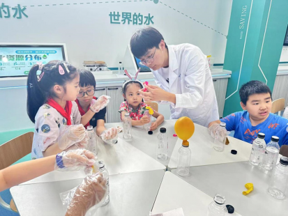 隨后,小記者們又來到了集展示、宣傳、體驗、教育為一體的供排水教育基地,教育基地內通過科普牌、沙盤模型、多媒體互動和現(xiàn)場講解方式對自來水的生產(chǎn)、污水處理的全過程以及飲用水的相關知識進行科普宣傳,并在過程中互動提問,小記者積極搶答,現(xiàn)場氣氛非常活躍。在節(jié)水篤行課堂上,通過開展“水垢清除”“酸堿變色”“硬幣滴水”等趣味十足的小實驗,讓小記者們沉浸式體驗了解水知識、水文化。